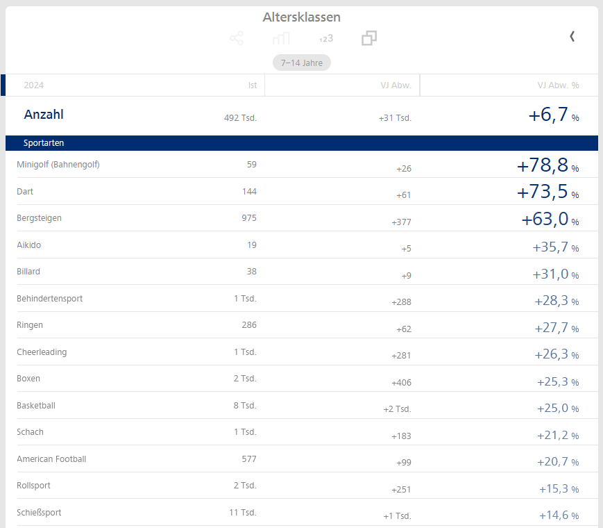 Insgesamt gesehen gab es mit den +6,7 % sowieso eine erfreuliche Entwicklung, von der die meisten Sportarten profitieren konnten.