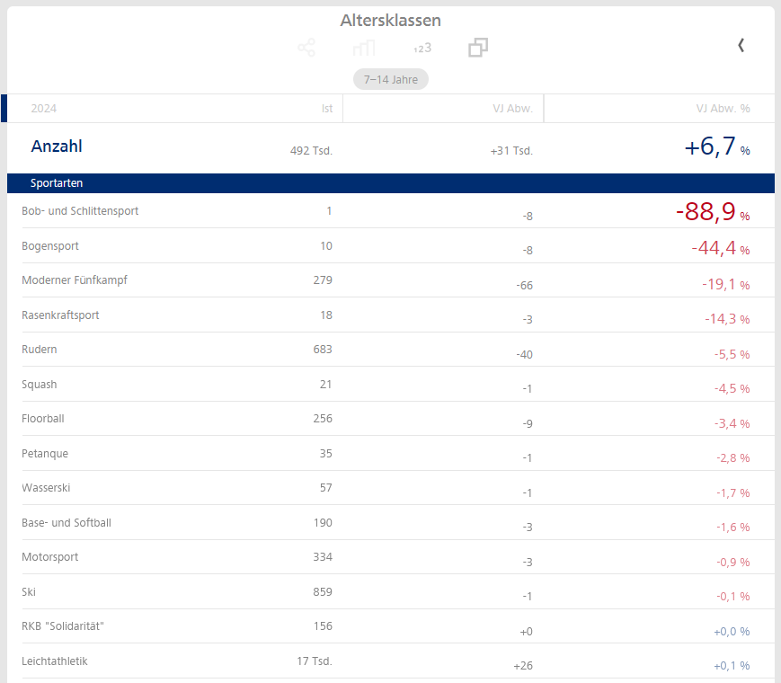 Für diese Darstellung habe ich das 3-Spalten-Layout gewählt, die Altersklasse 7 – 14 Jahre in den Filter gebracht und die relativen Abweichungen aufsteigend sortiert. Beim Bob- und Schlittensport gibt es nun nur noch 1 Vereinsmitglied, im Gegensatz zu 9 im Vorjahr. Auch der Bogensport hat beinahe die Hälfte an Vereinsmitgliedern in dieser Altersklasse verloren.