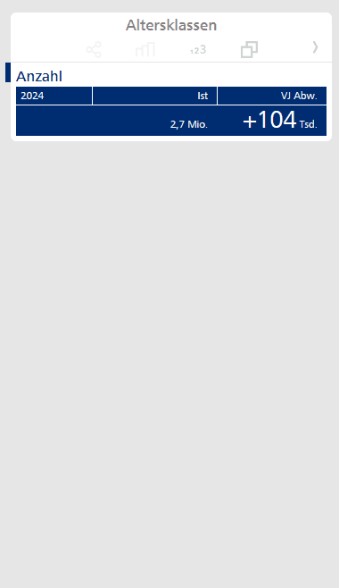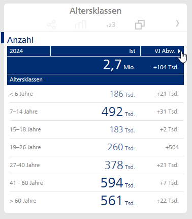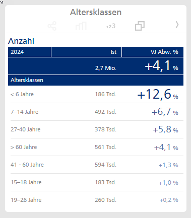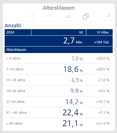 Die Prozentzahlen in der rechten Spalte geben nun nicht mehr relative Zuwächse gegenüber dem Vorjahreswert an, sondern relative Anteile am absoluten Gesamtzuwachs. Beispielsweise entsprechen die +21 Tsd. in der Altersklasse „< 6 Jahre“ bei einem Gesamtzuwachs von +104 Tsd. einem relativen Anteil von 20,0 %.