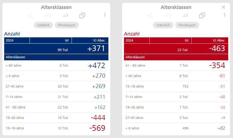 Bei den Sportarten, deren Gesamtzahlen den Gesamtzahlen der zugehörigen Fachsportverbände entsprechen, existiert neben dem Geschlecht auch noch eine Einteilung in Altersklassen. Ich könnte die Daten weiterhin in unserer BI-Software DeltaMaster inspizieren und interpretieren, möchte aber heute einmal unsere Browser-Anwendung DeltaApp Web in den Vordergrund stellen – und dies aus gutem Grund: Im Juli 2024 gab es ein neues Release 2.5.0 mit neuen Features, die ich anhand der Sportarten-Daten vorstellen möchte.