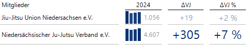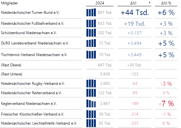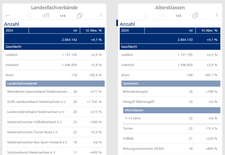 Der Landessportsport Niedersachsen veröffentlicht jährlich einen Bericht zu den aktuellen Entwicklungen in den Vereinen und den Sportverbänden. Die Daten extrahieren wir aus den PDFs, welche sich in der LSB-Sportbibliothek befinden. Ich habe mich dabei auf die drei Ausgaben von 2022, 2023 und 2024 beschränkt. Da die ausführlichen Zahlen immer mit dem Vorjahr verglichen werden, liegen somit Werte von 2021 bis 2024 vor. In unserer BI-Software DeltaMaster erstellen wir die obige Grafische Tabelle: