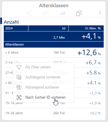 Wir möchten nun die Altersklassen aufsteigend nach Alter sortieren. Dazu wählen wir nach Rechtsklick auf einer der Altersklassen die Option „Nach Sortier-ID sortieren“. Für Releases < 2.5.0 waren hier Sortierpfeile anzuklicken: