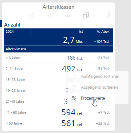 Es sei hier einmal angemerkt, dass die Altersklassen recht unterschiedlich groß ausfallen und somit ein fairer Vergleich der Altersklassen nicht so einfach durchführbar ist. Nichtsdestotrotz können wir die Anteile der Altersklassen am Bestand wieder leicht durch die über Rechtsklick auf einen Absolutwert erreichbare Option „% Prozentwerte“ ermitteln: