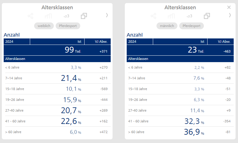Im Video werden über das Kontextmenü nach Rechtsklick Filter gesetzt – in früheren Versionen geschah dies durch Doppelklick. Es folgt ein Bild aus dem Video, das die unterschiedlichen Verteilungen auf die Altersklassen im Pferdesport thematisiert. Links sind die Elemente weiblich und Pferdesport im Filter, rechts männlich und Pferdesport.