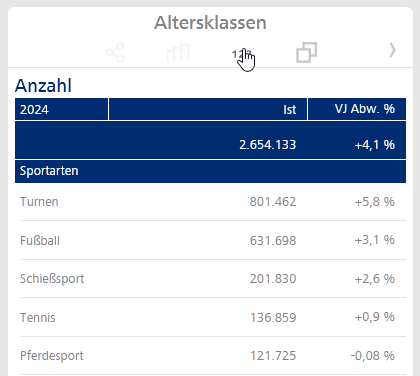 Bei den Landesfachverbänden liegt auch eine Historie von 4 Jahren von 2021 bis 2024 vor. Das sichtbare Sparksäulensymbol erinnert uns daran, dass wir durch einen Klick auf das Symbol diese historischen Werte einblenden könnten. Bei den Sportarten mit den Altersklassen fehlt die Historie und deshalb ist das Sparksäulen-Symbol nur schemenhaft sichtbar.