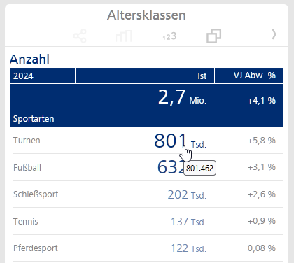 Standardmäßig wird die kompakte Zahlendarstellung voreingestellt; das heißt, wir sehen hier bei Turnen eine Anzahl von 801 Tsd. Die Zahlen sind typografisch skaliert: Größere Werte stellen wir auch größer dar.
