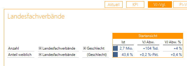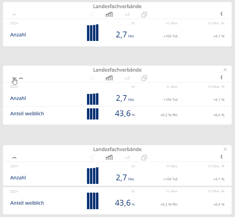 Zunächst benötigen wir eine Kachel mit mindestens zwei Kennzahlen. In der Kachel Landesfachverbände hatten wir Anzahl und Anteil weiblich definiert. Mit einem Klick auf den Pfeil nach rechts aktivieren wir die dreispaltige Ansicht, bei der absolute und relative Abweichungen zum Vorjahr gleichzeitig zu sehen sind. Weiterhin aktivieren wir – weil wir es können! – die Sparklines über das Symbol der drei ansteigenden Säulen. Für die gleich beschriebene Neuerung sind die Sparklines aber nicht zwingend erforderlich: