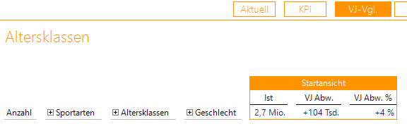 Nehmen wir dazu die Kachel Altersklassen her. Durch seitliches Wischen können wir Sportarten durch Altersklassen ersetzen. Wir können mit einer beliebigen Dimensionsebene beginnen, seien es die Sportarten, das Geschlecht oder eben die Altersklassen: