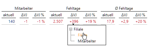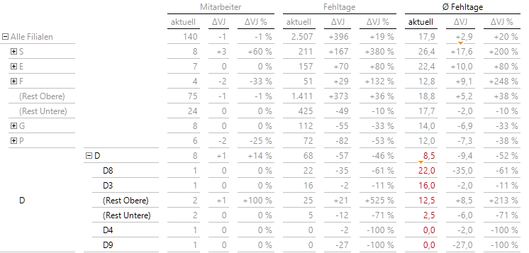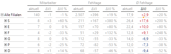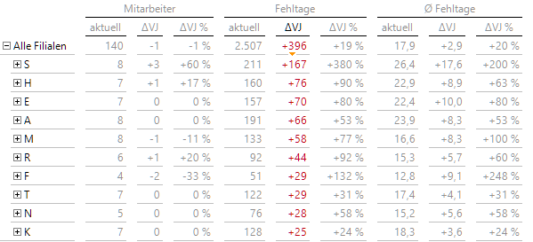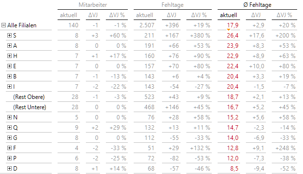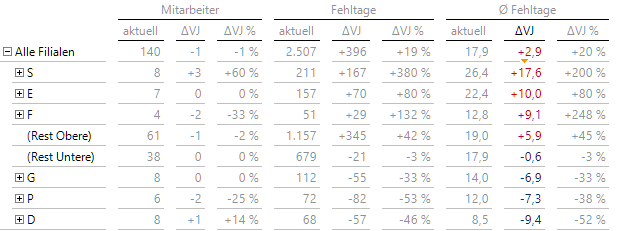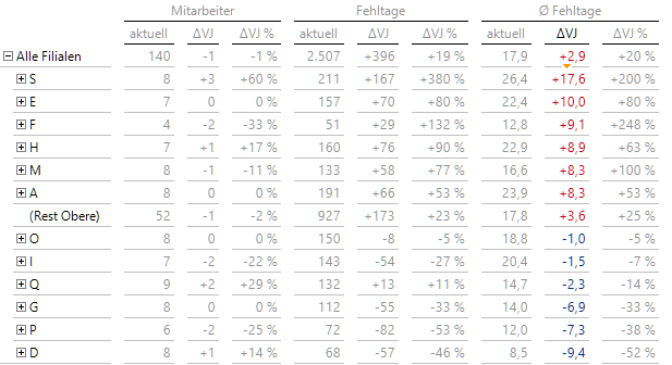 Navigieren wir nun bei der Änderung der durchschnittlichen Fehltage in die Ebene der Filialen, erhalten wir diese Ansicht: