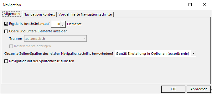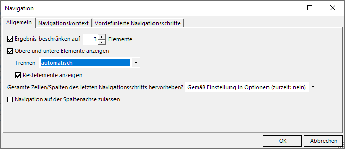 Unter dem Punkt Navigation bei Editieren können wir die Einstellungen für unsere Zwecke anpassen. Die für das eben gesehene Navigationsergebnis gültigen Standard-Einstellungen für die Grafische Tabelle sehen folgendermaßen aus: