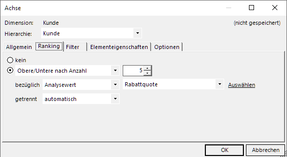 Uns interessieren nun die Kunden mit auffälligen Rabattquoten. Mit Rechtsklick auf die Zeilenachse der Kunden gelangen wir über „Achse bearbeiten“ zum Reiter Ranking:
