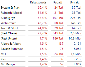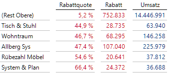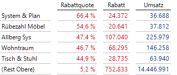Es wird nun (beginnend mit Release 6.5.8) eine Trennung beim Gesamtwert vorgenommen, der bei ca. 6,7 % liegt. Im Block der unteren Kunden entdecken wir neben etwas Beifang tatsächlich einen Großkunden, der trotz sparsamer Rabattvergabe ordentlich Umsatz erzeugt hat.