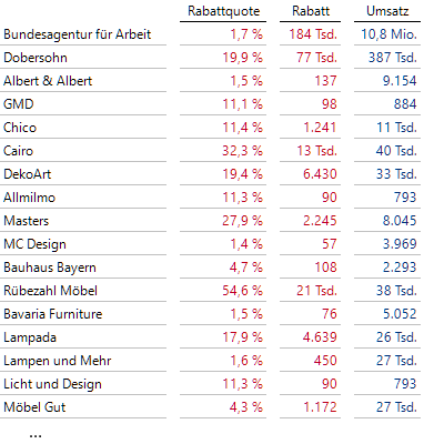 Betrachten wir etwa die Rabattquote (= Rabatt/Umsatz) der Kunden der Chair AG, dann entsteht eine längliche Tabelle, deren Anfang wir hier abgebildet sehen: