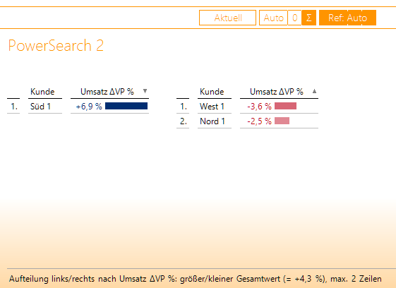 In der Magic-Buttons-Leiste ist im mittleren Block (Auto/0/∑) die 0 ausgewählt. Deshalb wird als Trennkriterium das Vorzeichen hergenommen und Gebiete mit einer positiven Umsatzentwicklung landen in der linken Gruppe und Gebiete mit einer negativen Umsatzentwicklung finden sich auf der rechten Seite wieder.