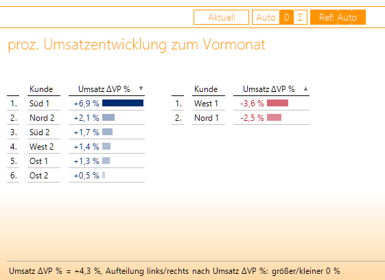 Die Alternative besteht im Trennkriterium, das sich an der Gesamt-Umsatzentwicklung aller Gebiete orientiert – unter Berücksichtigung etwaiger aktiver Filter. In der Statusleiste ist der zugehörige relative Zuwachs +4,3 % sichtbar. Aktiviert man den mit ∑ (stellvertretend für Gesamt) beschrifteten Magischen Knopf, so verändert sich die Aufteilung: