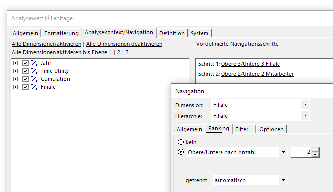 In den Eigenschaften einer ausgewählten Kennzahl lässt sich im Modellieren-Modus, Reiter Analysekontext/Navigation, das Verhalten bei den einzelnen Navigationsschritten noch genauer steuern: