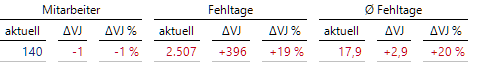 Unsere Ausgangstabelle zeigt die Anzahl der Mitarbeiter, die Summe aller Fehltage, die durchschnittlichen Fehltage im Jahr 2023 (aktuell) und die Entwicklung im Vergleich zum Vorjahr: