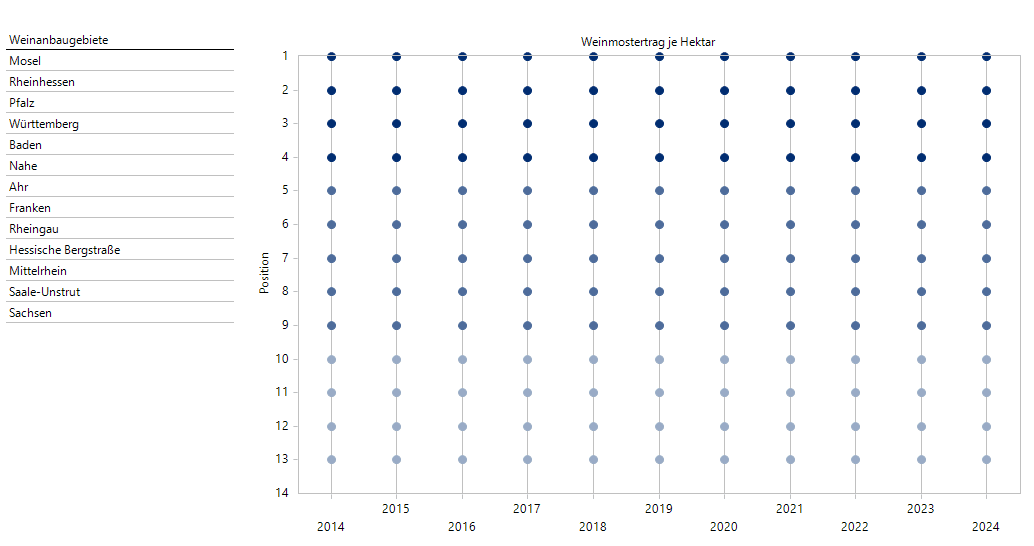 Anfangs hatten wir festgestellt, dass sich die Rebfläche im Ertrag im Laufe der Zeit leicht erhöht hat, und die Dynamische Portfolioanalyse legte den Schluss nahe, dass wir in Rheinhessen den entscheidenden Akteur vor uns haben. Schauen wir uns für eine genaue Analyse die folgende Grafische Tabelle an: