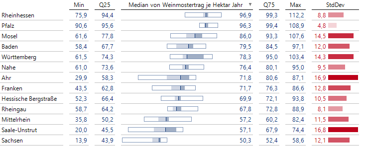 Für diese Grafische Tabelle habe ich ein Zeitanalyseelement mit der Differenz der Werte von 2024 und 2014 angelegt. Die Weinanbaugebiete sind nach ihrem Nettobeitrag absteigend sortiert.