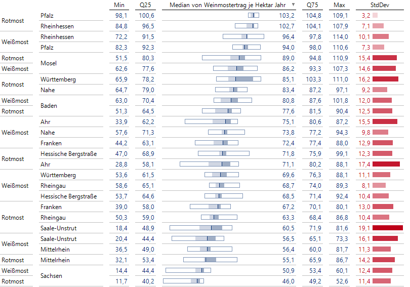Wir haben dazu eine einfache Grafische Tabelle mit den Jahren auf der Zeilenachse und den Mostarten auf der Spaltenachse über die 8 größten Weinanbaugebiete iteriert. Mittels Bissantz’Numbers betonen wir die großen Werte.
