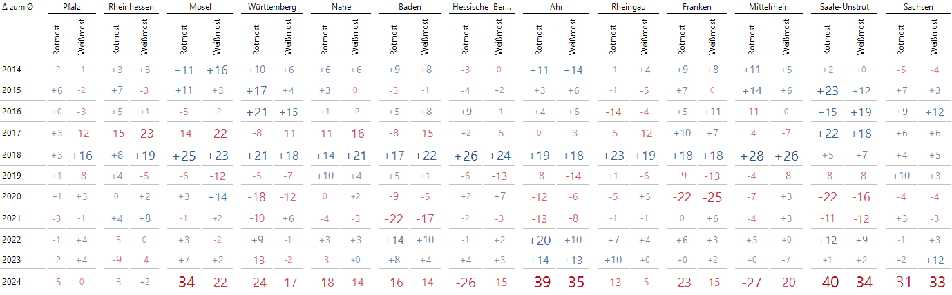 Werfen wir einen Blick auf die rechte, also die Negativseite. Hier fällt Württemberg im Jahr 2021 auf. Üblicherweise liegt hier Rotmost um ca. 19 [hl je ha] über Weißmost. Im Jahre 2021 betrug die Differenz allerdings nur 4.