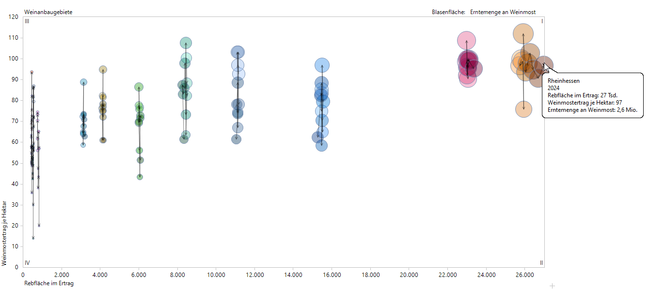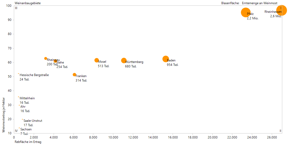 Die Blasenfläche ist proportional zur Erntemenge an Weinmost. Es wird deutlich, dass die Weinanbaugebiete mit dem größten Weinmostertrag je Hektar auch die größten Flächen für den Weinanbau zur Verfügung stellen.