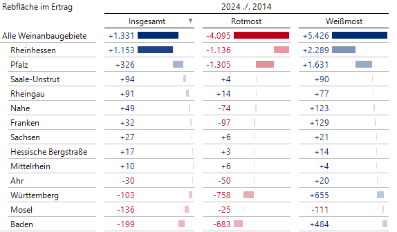 Die nächstgrößeren Weinanbaugebiete Württemberg, Mosel und Baden fallen am Ende der Tabelle mit negativen Nettobeiträgen auf. Bei ihnen hat sich somit die Rebfläche im Ertrag in den 10 Jahren verringert.