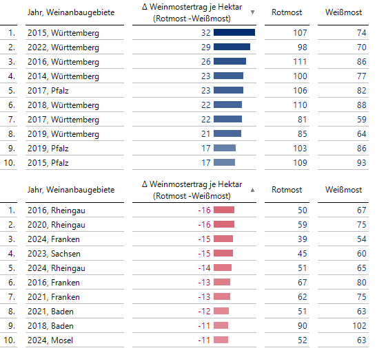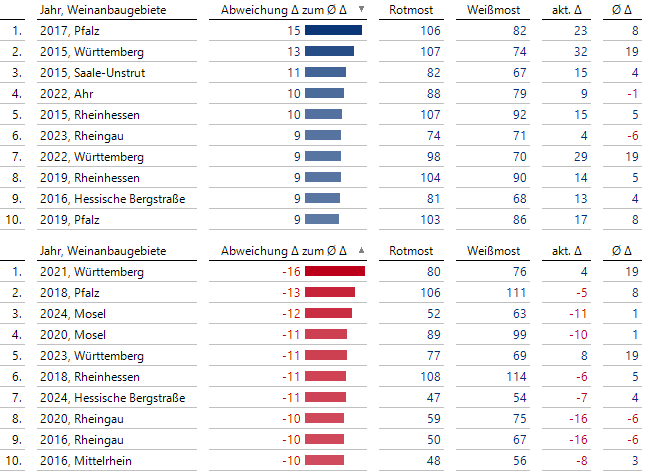 Die Interpretation beispielsweise des ersten Eintrags auf der Positivseite läuft folgendermaßen ab: In der Pfalz lag der Rotmost-Ertrag im Durchschnitt um 8 [hl je ha] über dem Weißmost-Ertrag. Im Jahr 2017 betrug der Abstand zwischen Rotmost und Weißmost jedoch 23 [hl je ha]. Das ist um 15 [hl je ha] höher als der Durchschnittswert.
