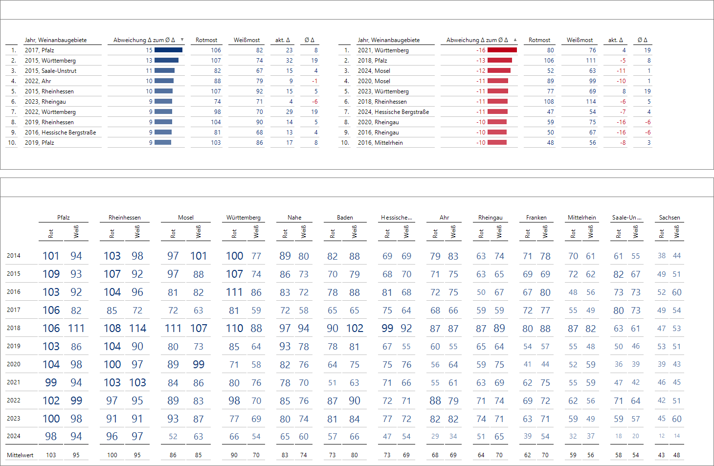 Wenn uns für ein Weinanbaugebiet und eine Mostart nur die Abweichung zum langjährigen Durchschnitt bei dieser Kombination interessiert, können wir diese Abweichungen direkt angeben: