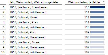 Die Top-Weinmosterträge je Hektar sind in den bereits bekannten Weinanbaugebieten Pfalz, Rheinhessen, Mosel und Württemberg zu finden. Rotmost kommt mit 7 Nennungen etwas häufiger vor als Weißmost. 6 der 10 Werte stammen aus dem Rekordjahr 2018 und 3 Werte aus 2015.