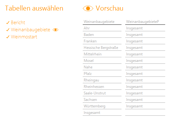 - Weinanbaugebiete: Beispielsweise Rheinhessen, Pfalz, Baden, Franken usw., zusätzlich eine vorberechnete Größe Insgesamt
