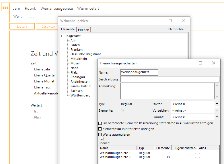 Dort deaktivieren wir die Checkbox Werte aggregieren. Analog gehen wir im Fall der Dimension Weinmost-Art vor.