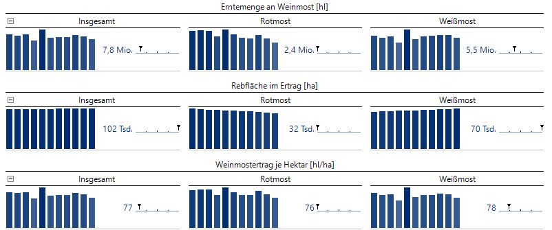 Zumindest erkennen wir, dass die Werte des Weinmostertrags je Hektar doch recht stark schwanken können und auch für die kleinen Anbaugebiete deutlich höher ausfallen können, als es im Jahr 2024 zu beobachten war.