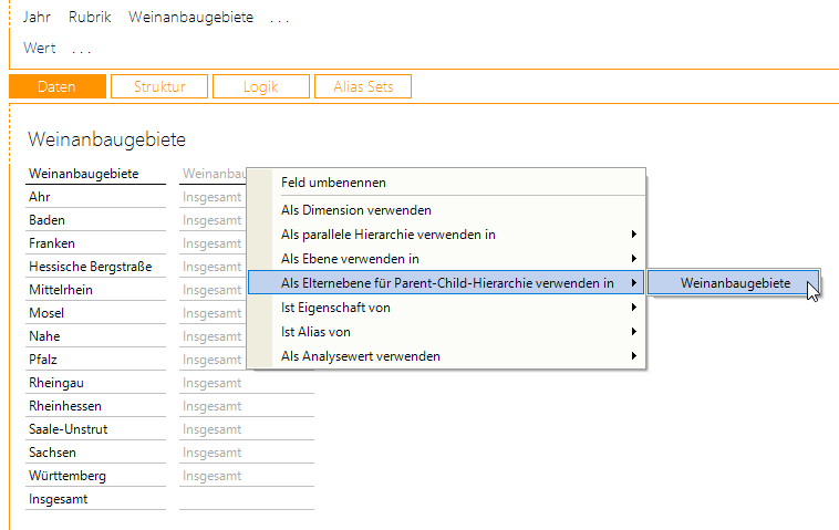 Um die beiden Parent-Child-Hierarchien anzubinden, wechseln wir zunächst zur Tabelle Weinanbaugebiete und deklarieren Weinanbaugebiete als Dimension und die zweite Spalte als Elternebene: