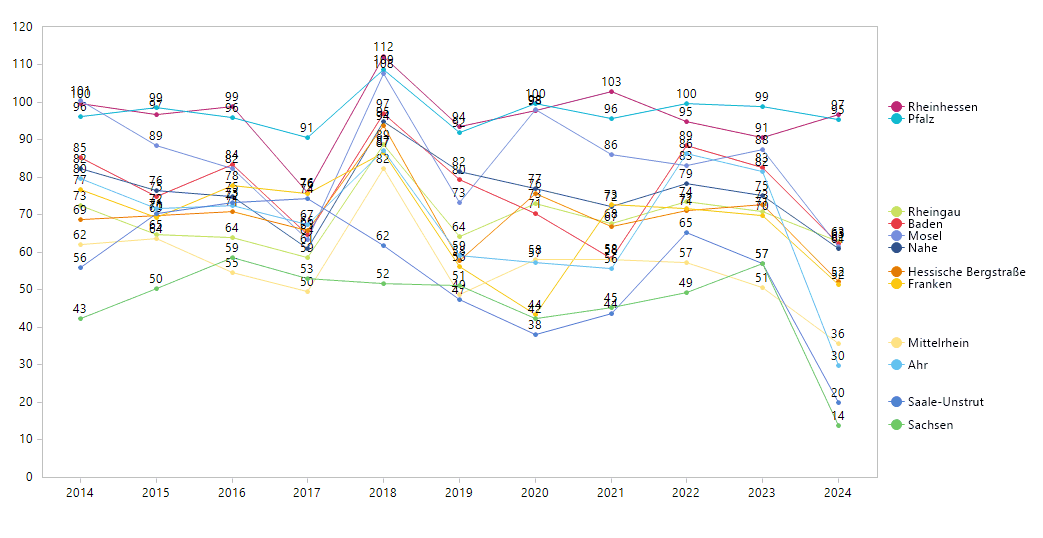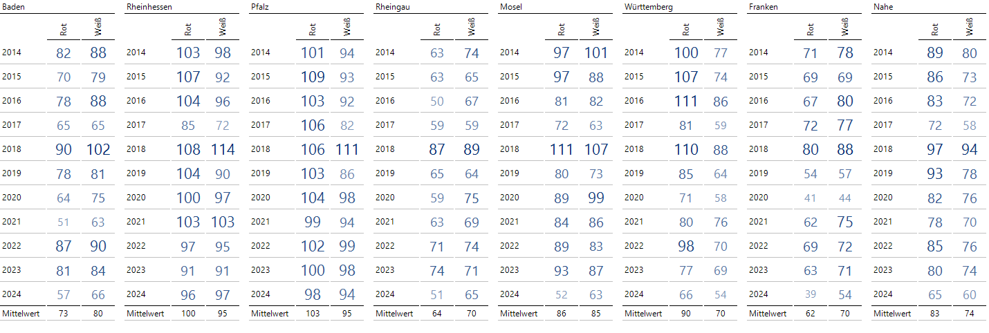 Es ist leicht zu erkennen, dass das Jahr 2018 ein gutes Weinjahr war, während das Jahr 2024 zumindest quantitativ deutlich unter den Erwartungen lag.