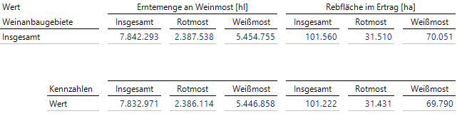 - Rebfläche im Ertrag in Hektar: Dazu gehören nicht die Flächen mit jungen Weinreben, bei denen noch keine Weinlese stattfindet, und auch nicht die Flächen mit Trauben, die für Traubensaft verwendet werden.