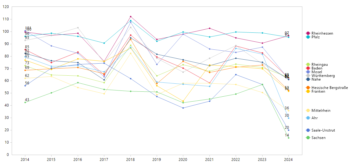 Das Jahr 2018 war ein gutes Weinjahr und bis auf zwei kleine Ausnahmen (Saale-Unstrut und Sachsen) verzeichnen alle Weinanbaugebiete eine Top-Ernte. Diese 11 von 13 Weinanbaugebieten nehmen im Jahr 2018 sogar das Maximum auf dem betrachteten Zeitraum an.