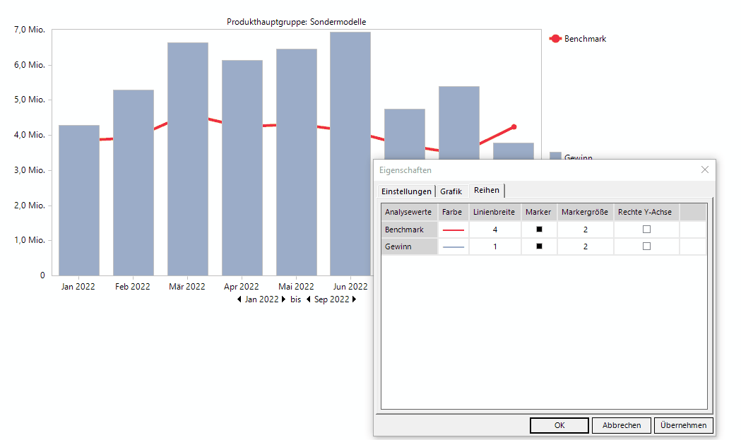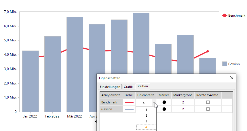 Die genannten Eigenschaften sind grundsätzlich für Linien-Diagramme gedacht. Werden andere Grafiktypen verwendet, werden damit bestimmte Eigenschaften dieser Typen eingestellt. Beim Säulendiagramm steuert Linienbreite beispielsweise die Dicke der Umrandung der Säule.