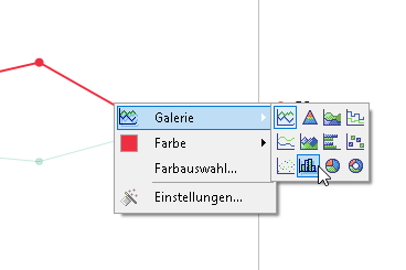 Bei zwei sich kreuzenden Linien ist die Reihenfolge des Zeichnens vielleicht noch nicht besonders kritisch. In der Zeitreihenanalyse ist es aber möglich, jeder einzelnen Zeitreihe einen eigenen Typ zuzuweisen. Dazu wird eine einzelne Linie markiert und über rechtem Mausklick aus der Galerie ein anderer Visualisierungstyp zugewiesen: