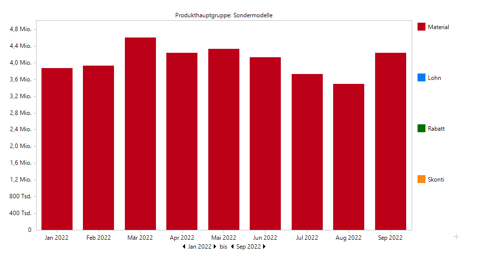 Betrachten wir dazu für die Produkthauptgruppe Sondermodelle unseres fiktiven Stühle-Herstellers Chair AG die Hauptbestandteile einer Deckungsbeitragsrechnung: Umsatz, DB und den größten Kostenverursacher Material.