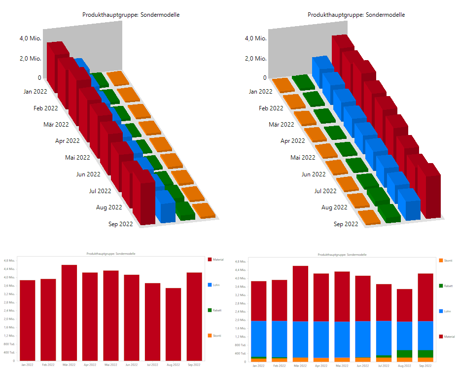 Durch die Reihenfolge der Reihen in den Eigenschaften steuern wir auch die Reihenfolge der Kostenarten der Säulen, hier von Skonti über Rabatt und Lohn nach Material.