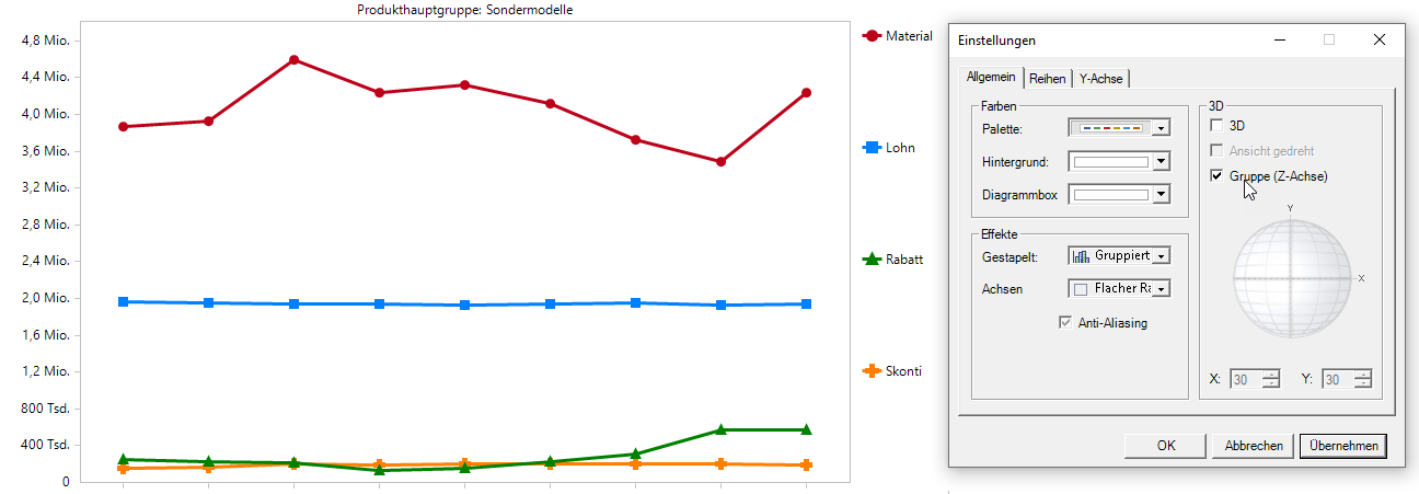 Solange Sie nur mit Liniendiagrammen arbeiten, benötigen Sie die Einstellung Gruppe (Z-Achse) nie, da Sie ja die Reihenfolge in der Legende selbst festlegen können.