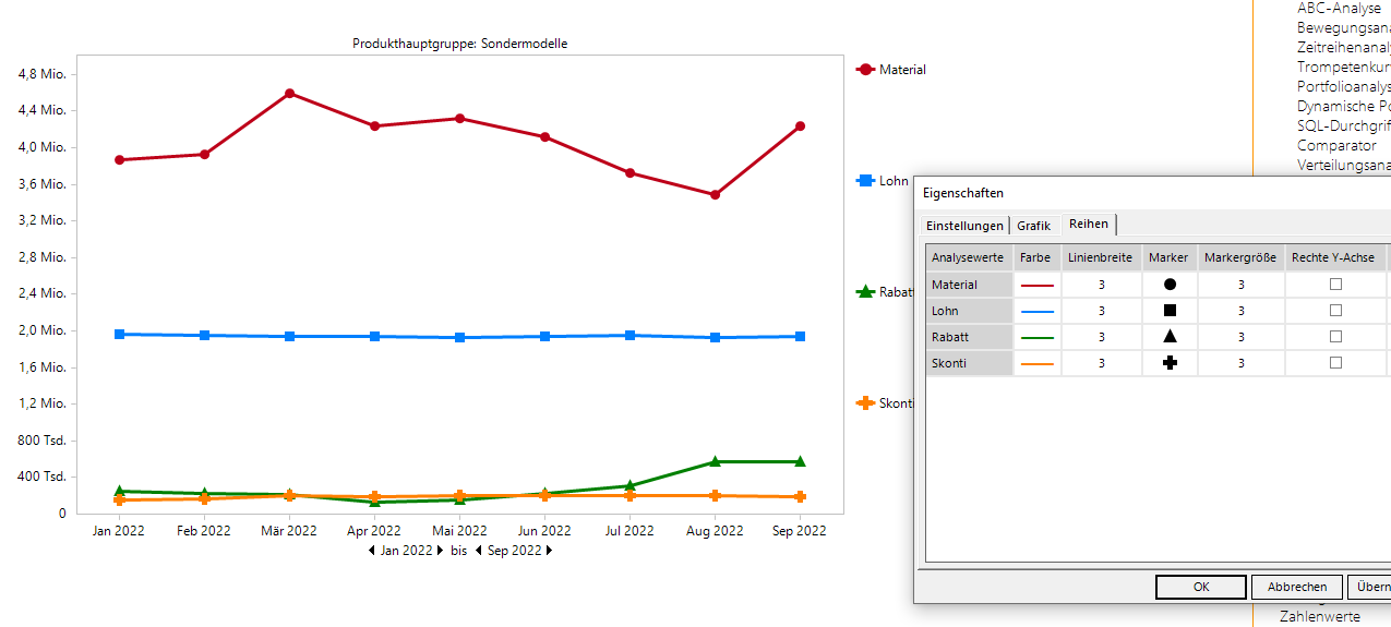 Bei den Farben erhalten die ersten drei Zeitreihen, die ich ja per Drag-and-drop der Reihe nach in die Analyse ziehe, die Farben Blau, Grün und Rot (danach kämen Gelb, Hellblau, Orange, …). Für die vorliegende Grafik heißt das, dass ich zuerst Umsatz, dann Material und schließlich den DB in die Zeitreihenanalyse gezogen habe.