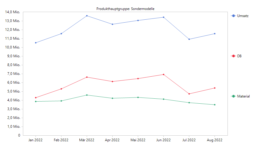 Umsatz, DB und Materialkosten im Zeitverlauf bis August