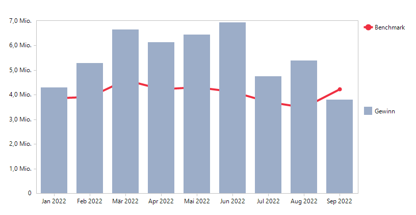 Stellen wir uns nun also vor, dass anstelle von Material ein Gewinn eines Vertriebsteams dargestellt wird, und zwar als Säulenreihe. Darüber soll eine Vergleichsvorgabe, ein Benchmark, als Linienzug gelegt werden. Sollte der letzte Wert des Benchmarks oberhalb des letzten Werts des Gewinns liegen, entsteht das folgende, unerquickliche Bild: