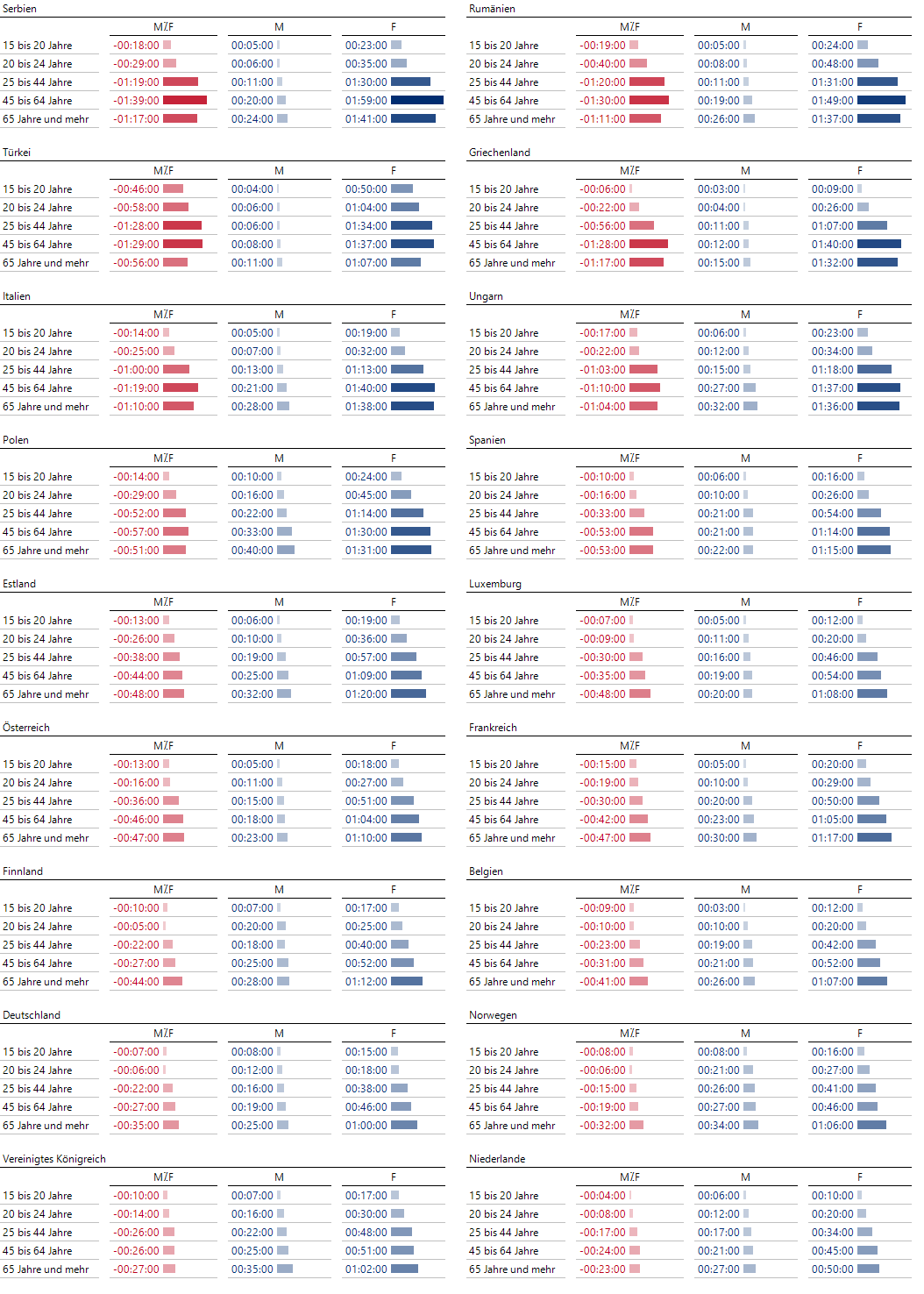 Bis auf die Ausnahme Reinigung der Wohnung sind Frauen in den genannten Ländern deutlich länger mit Kochen beschäftigt als die Männer. Im Schnitt über alle Personen dieser Altersklasse, also auch über diejenigen, die gar nicht arbeiten, gilt andererseits, dass Männer mehr Zeit für die Erwerbstätigkeit aufwenden.