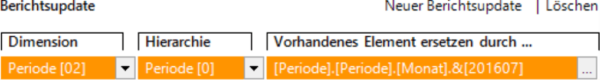 - Beim Berichtsupdate ändert DeltaMaster in allen Berichten die Sicht (die Filter) und stellt in jeder angegebenen Dimension die ausgewählten Elemente ein. Im Beispiel soll die Periode auf Juli 2016 geändert werden. Typischer Anwendungsfall: Der Monatsabschluss ist fertig, die Daten im Würfel sind frisch aufbereitet; nun muss in allen Berichten der neue Monat eingestellt werden. Auf Schritt 3, die Ausgabe, hat das Berichtsupdate keine unmittelbare Auswirkung.
