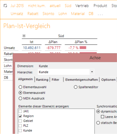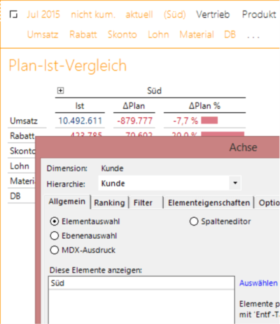 Der Berichtsredakteur hat sich dafür entschieden, die Region als Elementauswahl in der Achsendefinition einzustellen. Das kündigte sich schon im Präsentationsmodus an, in der vorigen Abbildung: Die Region „Süd“ steht in Klammern. Die Klammern besagen: Der Filter ist im aktuellen Bericht zwar eingestellt, wird aber nicht angewendet – die Festlegung in der Achsendefinition hat Vorrang, der Filter ist in diesem Bericht wirkungslos. Und auch dem Publisher ist ein Element nicht zugänglich, das als Elementauswahl in der Achsendefinition ausgewählt ist. Das ist ja gerade das Wesen der Elementauswahl in der Achsendefinition: Was hier eingestellt ist, gilt unabhängig von der Sicht und ist damit auch unabhängig von Berichtsupdate und Berichtsgenerator.