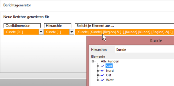 - Im Berichtsgenerator legt man mehrere Elemente fest, die in einer Schleife verarbeitet werden (Iteration), um die Sicht (die Filter) wiederholt zu ändern. Auf Schritt 3, die Ausgabe, hat der Berichtsgenerator unmittelbar Auswirkung: Für jedes Element dieser Schleife wird eine eigene Ausgabe erzeugt. Beispielsweise soll für jeden Außendienstmitarbeiter, Kostenstellenleiter usw. eine eigene Berichtsmappe erstellt und etwa eine eigene E-Mail versendet werden. Im Beispiel sind in der Kundendimension die Elemente „Nord“, „Süd“, „Ost“ und „West“ ausgewählt. Das bewirkt Folgendes: Zuerst werden alle Berichte aus der Berichtsquelle auf das Element „Nord“ umgestellt, mit dieser Filtereinstellung berechnet, ausgegeben (zum Beispiel im HTML-Format) und verteilt (zum Beispiel per E-Mail). Dann ist das nächste Element an der Reihe, „Süd“. Wieder stellt DeltaMaster die Filter in allen Berichten um, berechnet sie neu, erzeugt die Ausgabedatei(en) und versendet das Ergebnis. Anschließend wird „Ost“ verarbeitet, schließlich „West“.