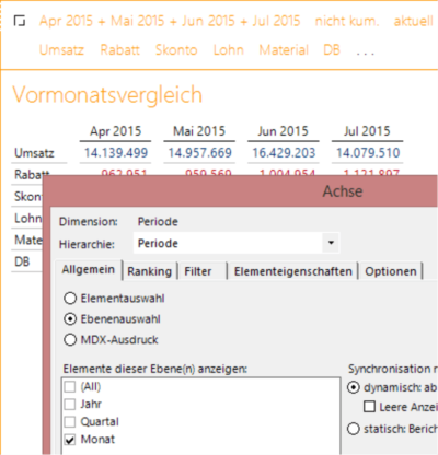In einem ersten Versuch wurde der Bericht so entworfen, dass die Monate in der Sicht eingestellt und in der Achsendefinition als Ebenenauswahl referenziert sind. Das kann man so machen – aber es geht geschickter. Das Problem beim Publizieren ist: Würde man diesen Bericht im nächsten Monat fortschreiben wollen und dazu vier neue Monate im Berichtsupdate einstellen, so erhielte man in diesem speziellen Bericht zwar tatsächlich das erwünschte Ergebnis. Allerdings stellte man diese Sicht zugleich für alle anderen Berichte in der Berichtsquelle ein, mit dem mutmaßlich unerwünschten Ergebnis, dass in vielen anderen Berichten womöglich die Summe der vier Monate ausgewiesen wird.
